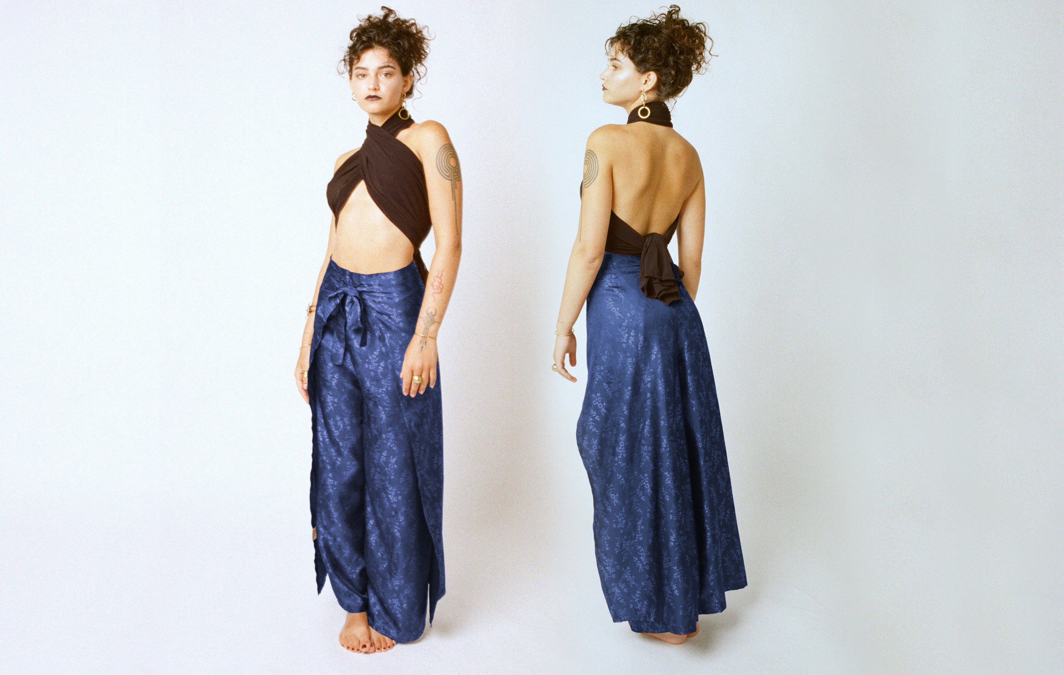 The summer season handmade wrap pants with a shiny touch. Tulin the brand and this collection reflects the sun and the female body.