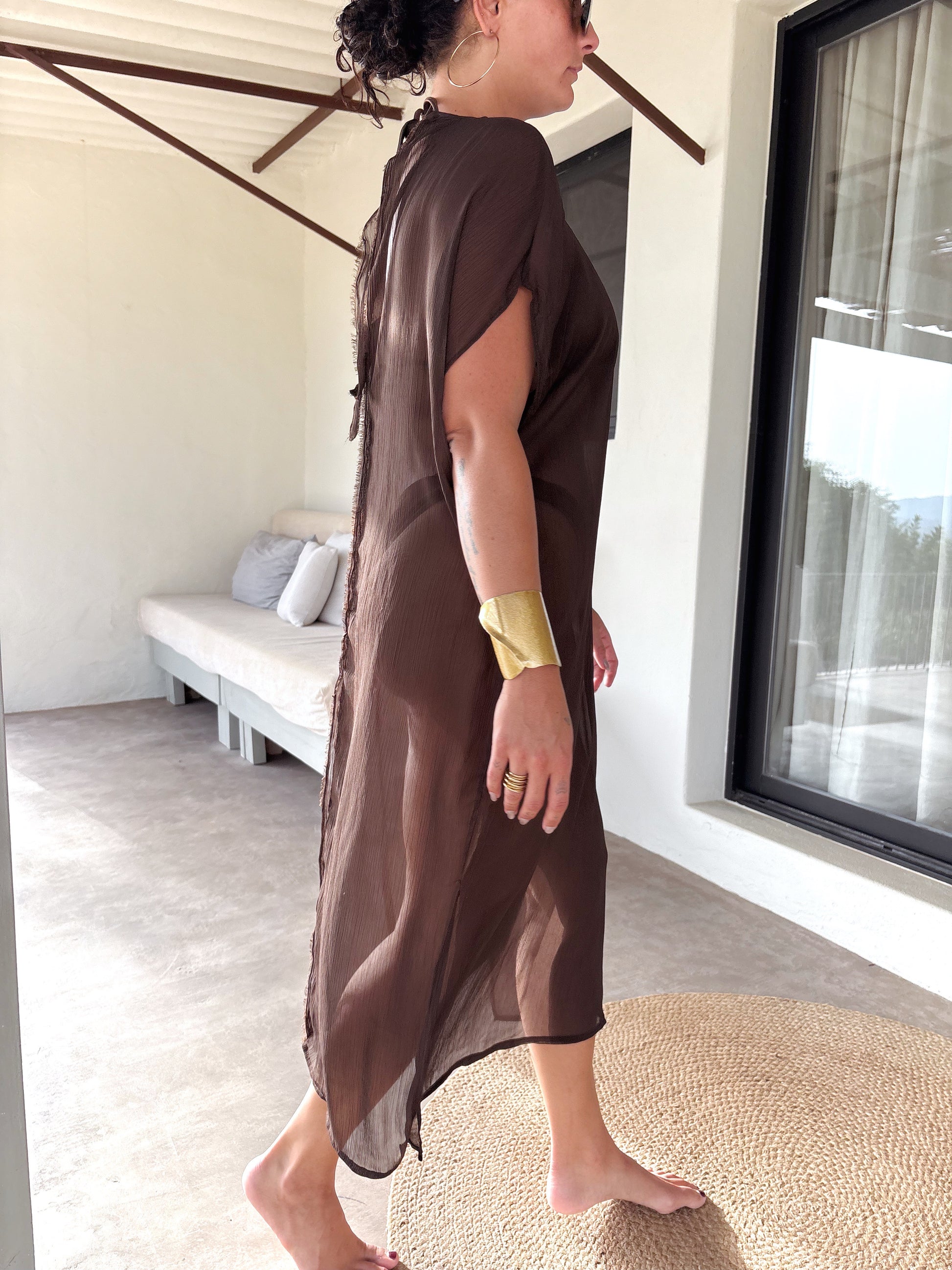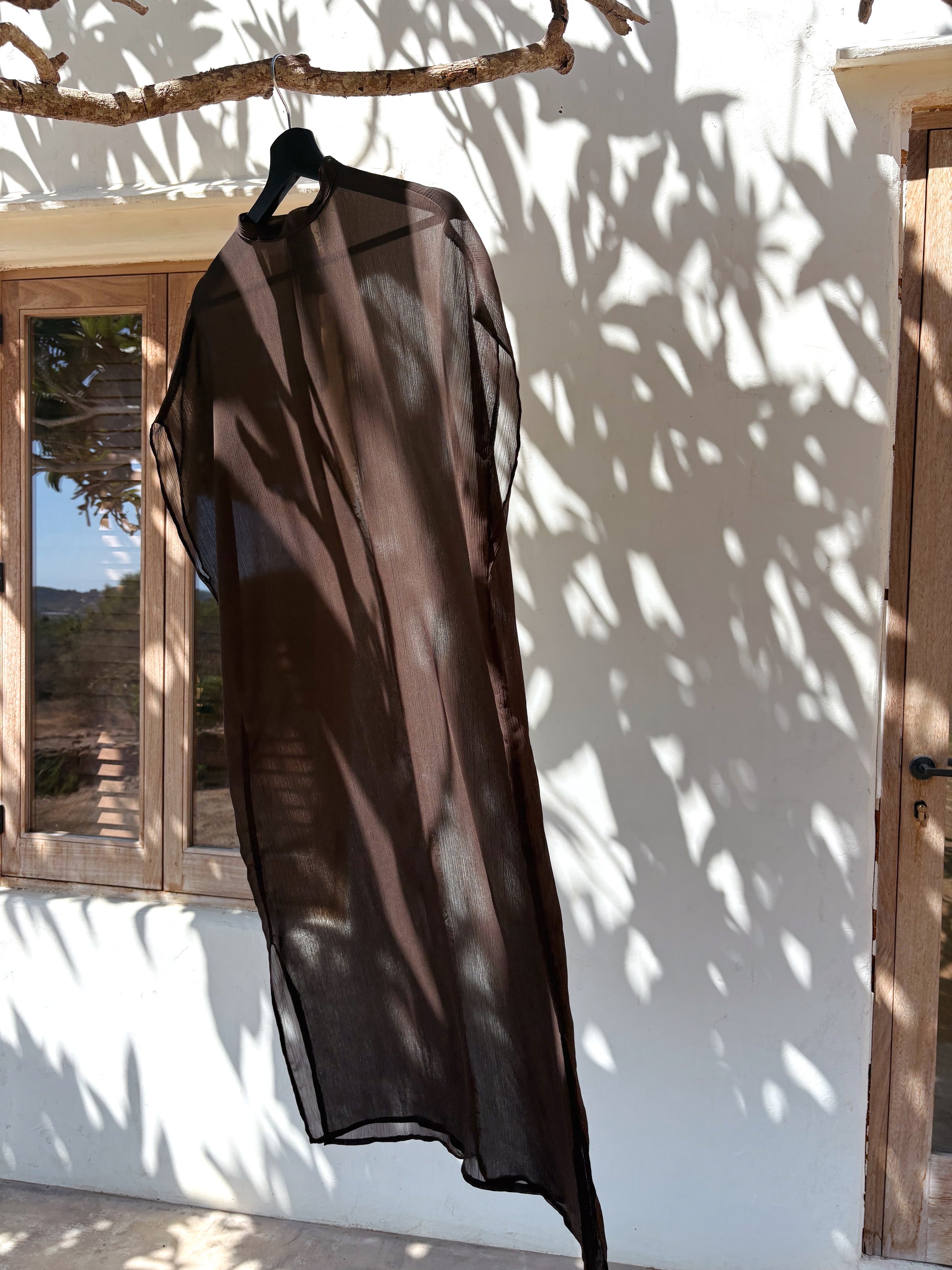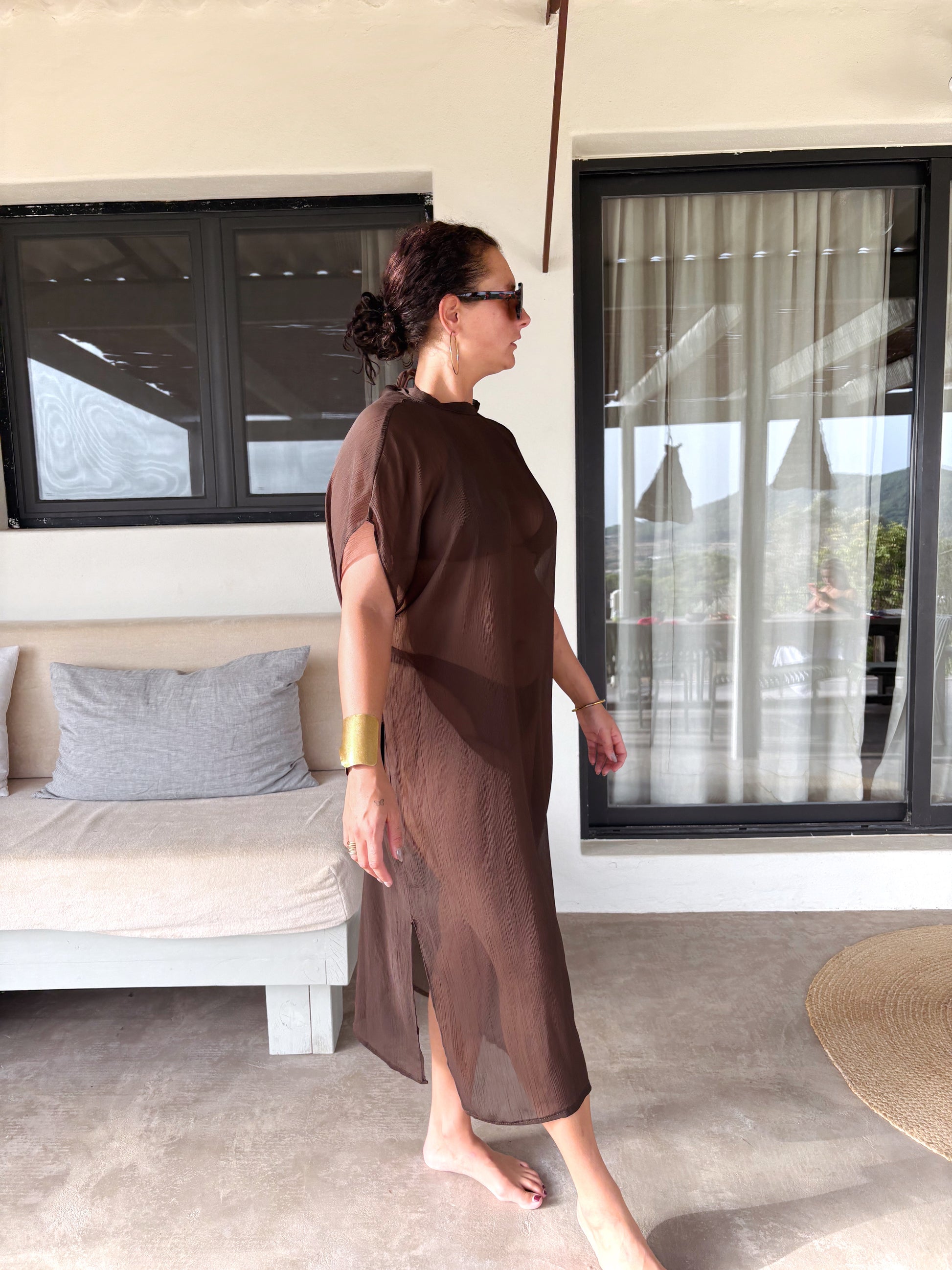 The Brown Ease Kaftan is a semi-sheer, ankle-length piece designed to flow effortlessly over your bikini or lingerie. Crafted in a breathable, lightweight fabric with a subtle crinkled texture, it features a high crew neckline, relaxed short sleeves, and a graceful silhouette with side slits for ease of movement and an elegant drape (approx. 140 cm).
