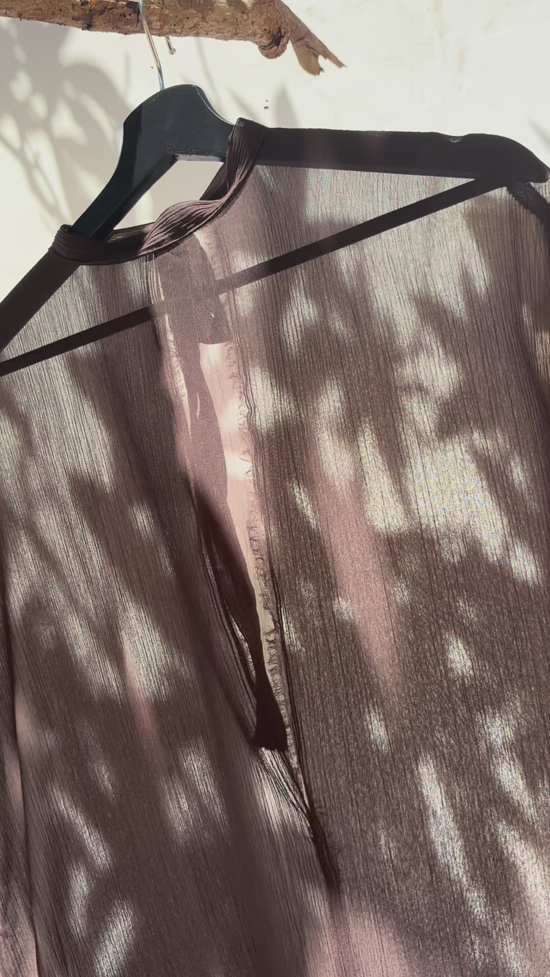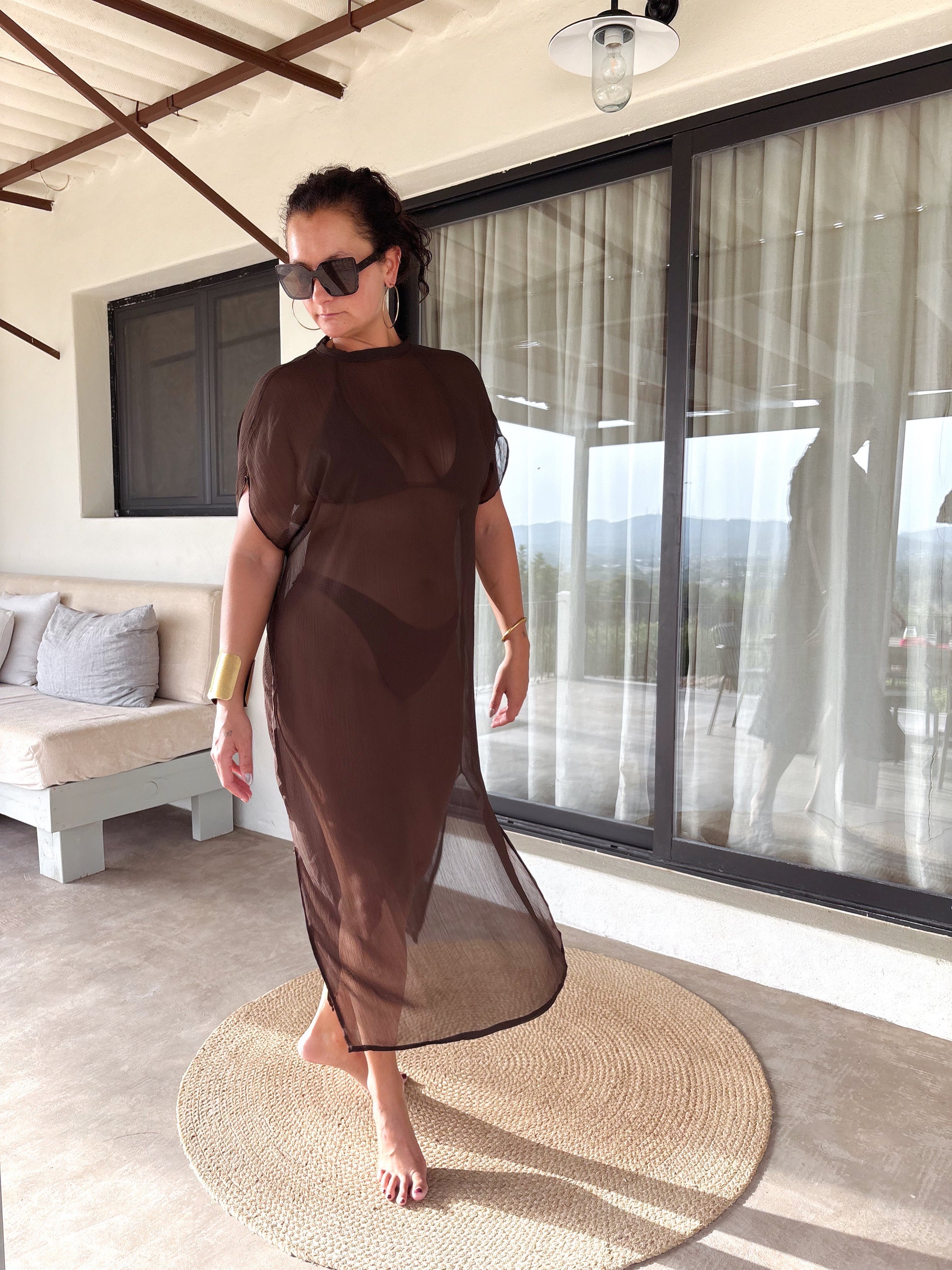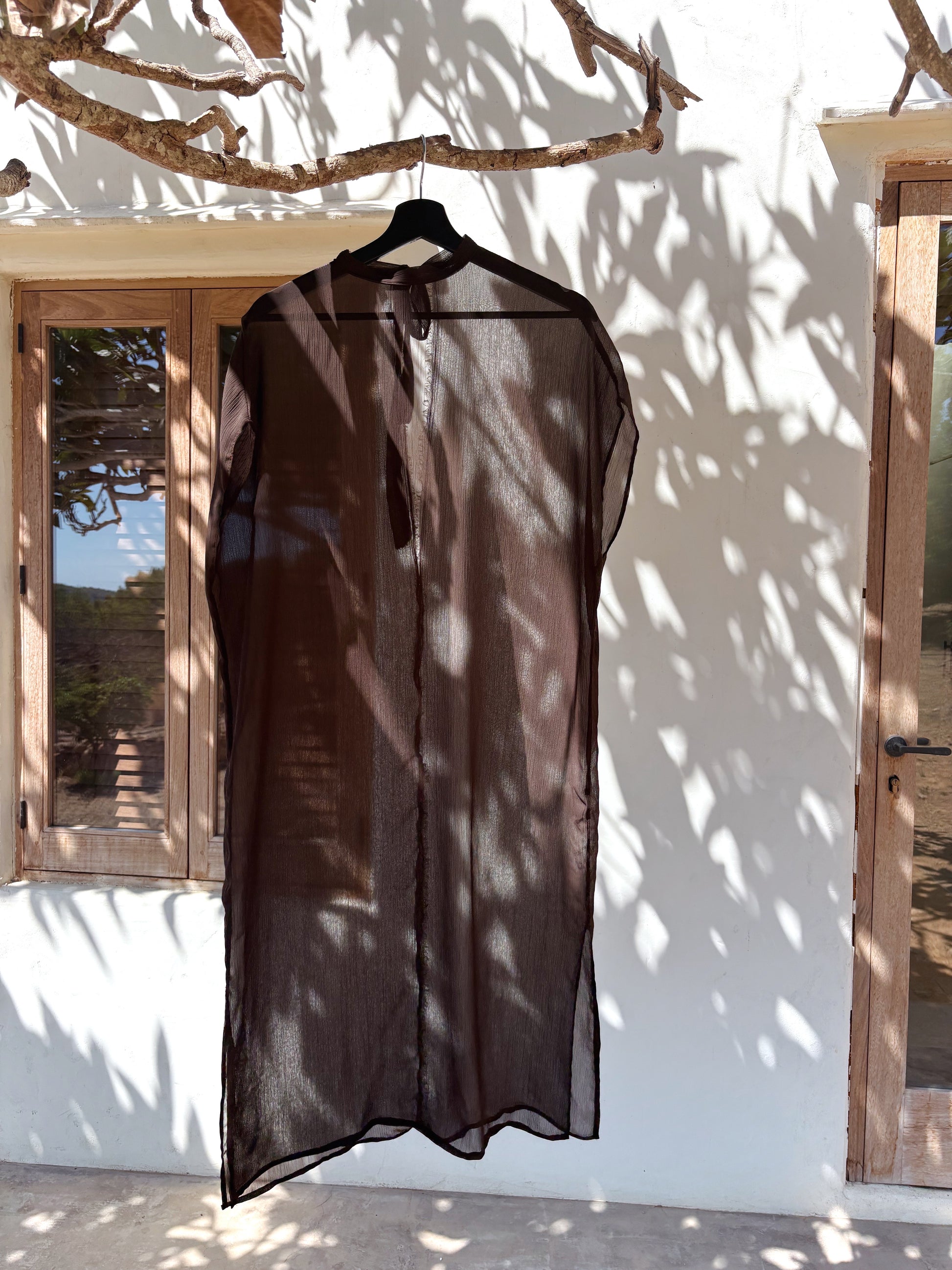 The Brown Ease Kaftan is a semi-sheer, ankle-length piece designed to flow effortlessly over your bikini or lingerie. Crafted in a breathable, lightweight fabric with a subtle crinkled texture, it features a high crew neckline, relaxed short sleeves, and a graceful silhouette with side slits for ease of movement and an elegant drape (approx. 140 cm).