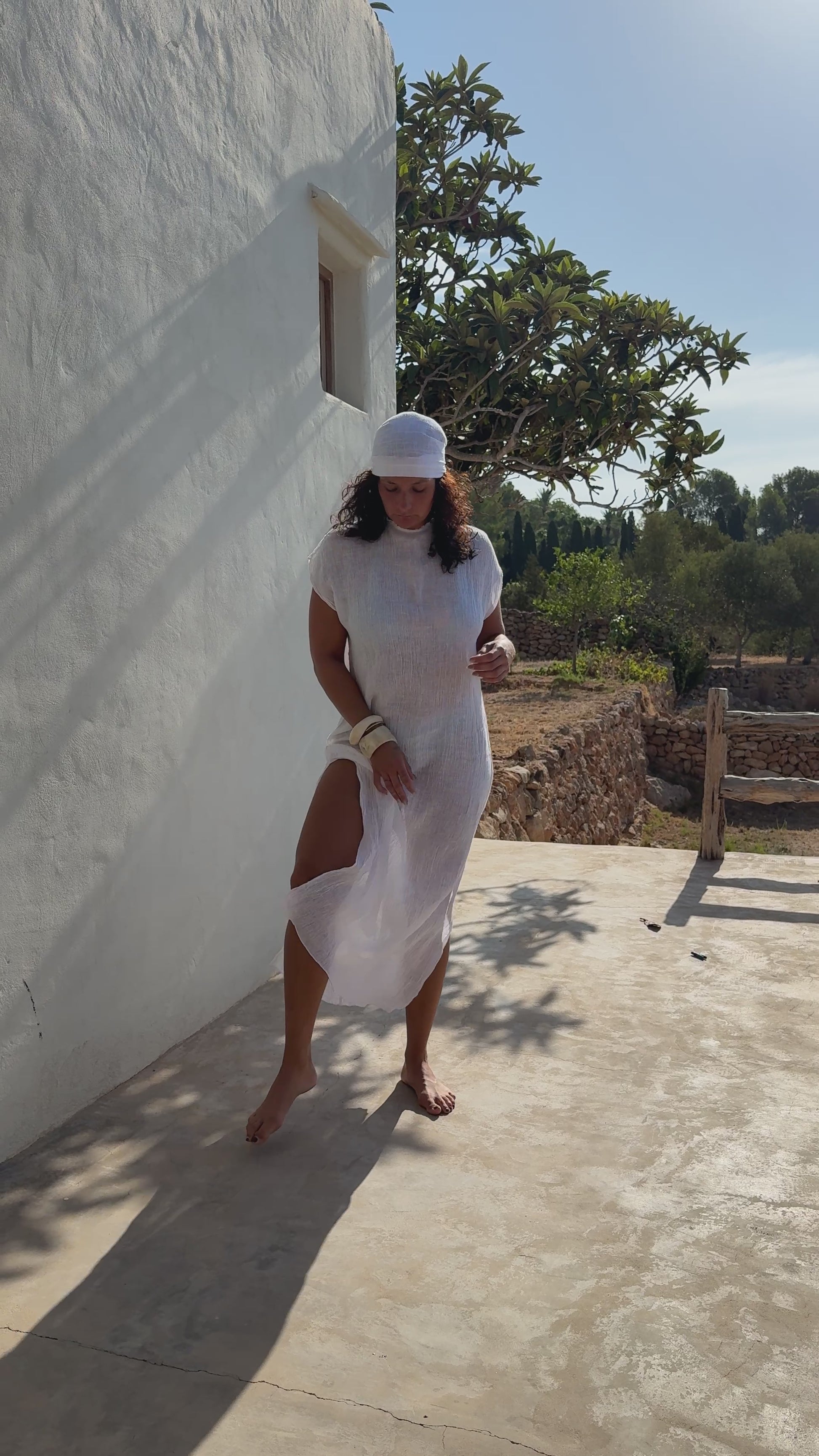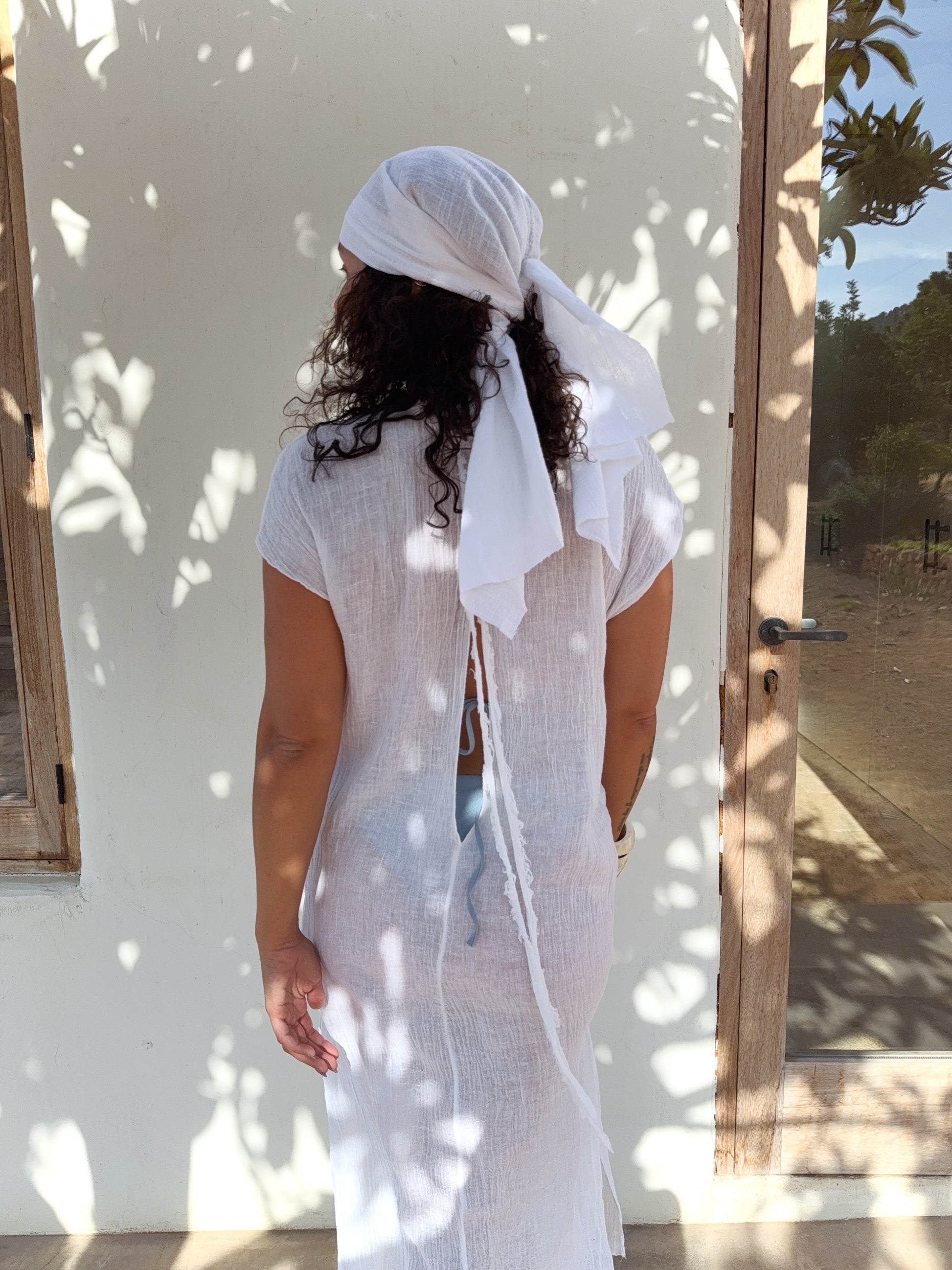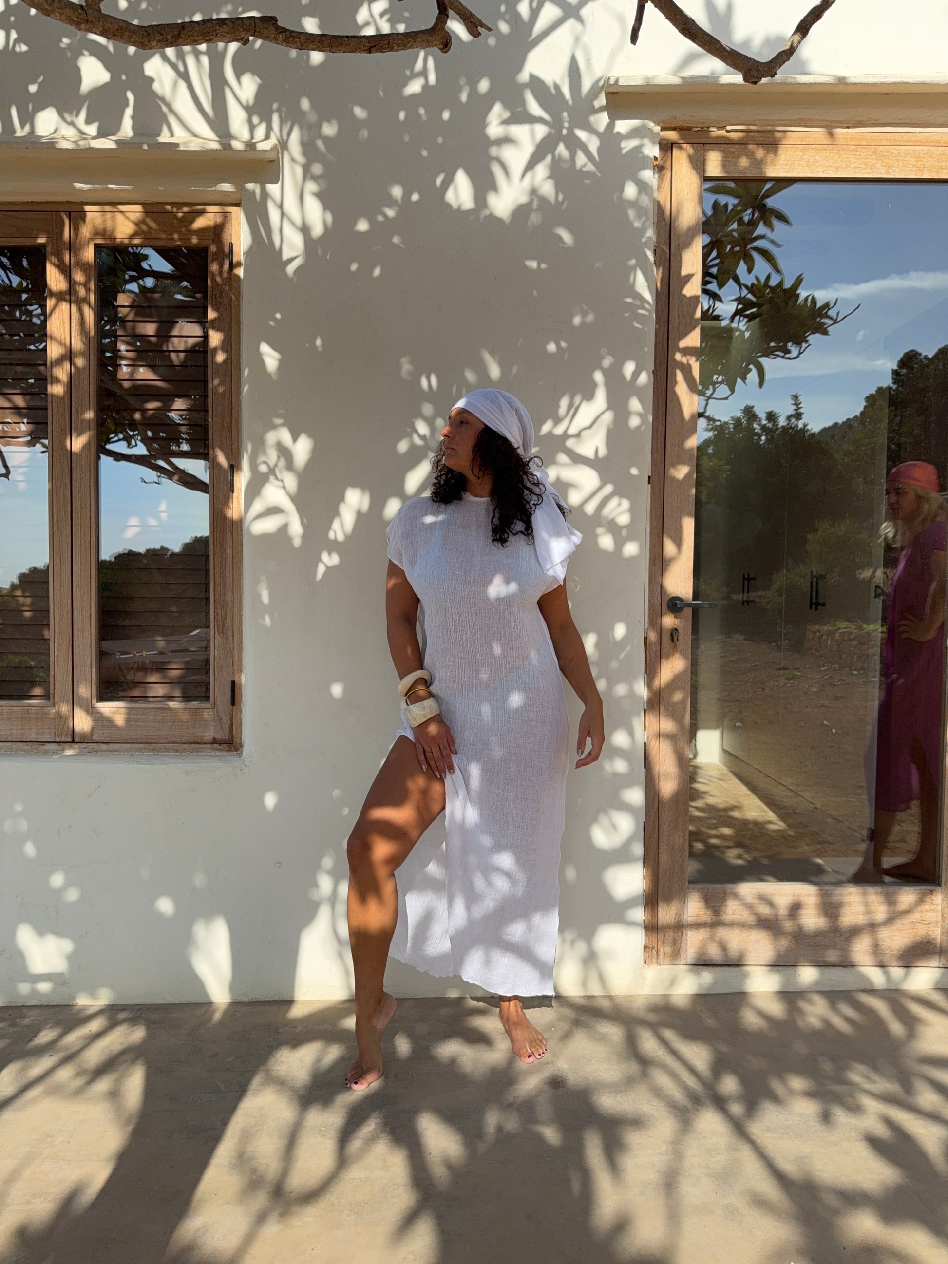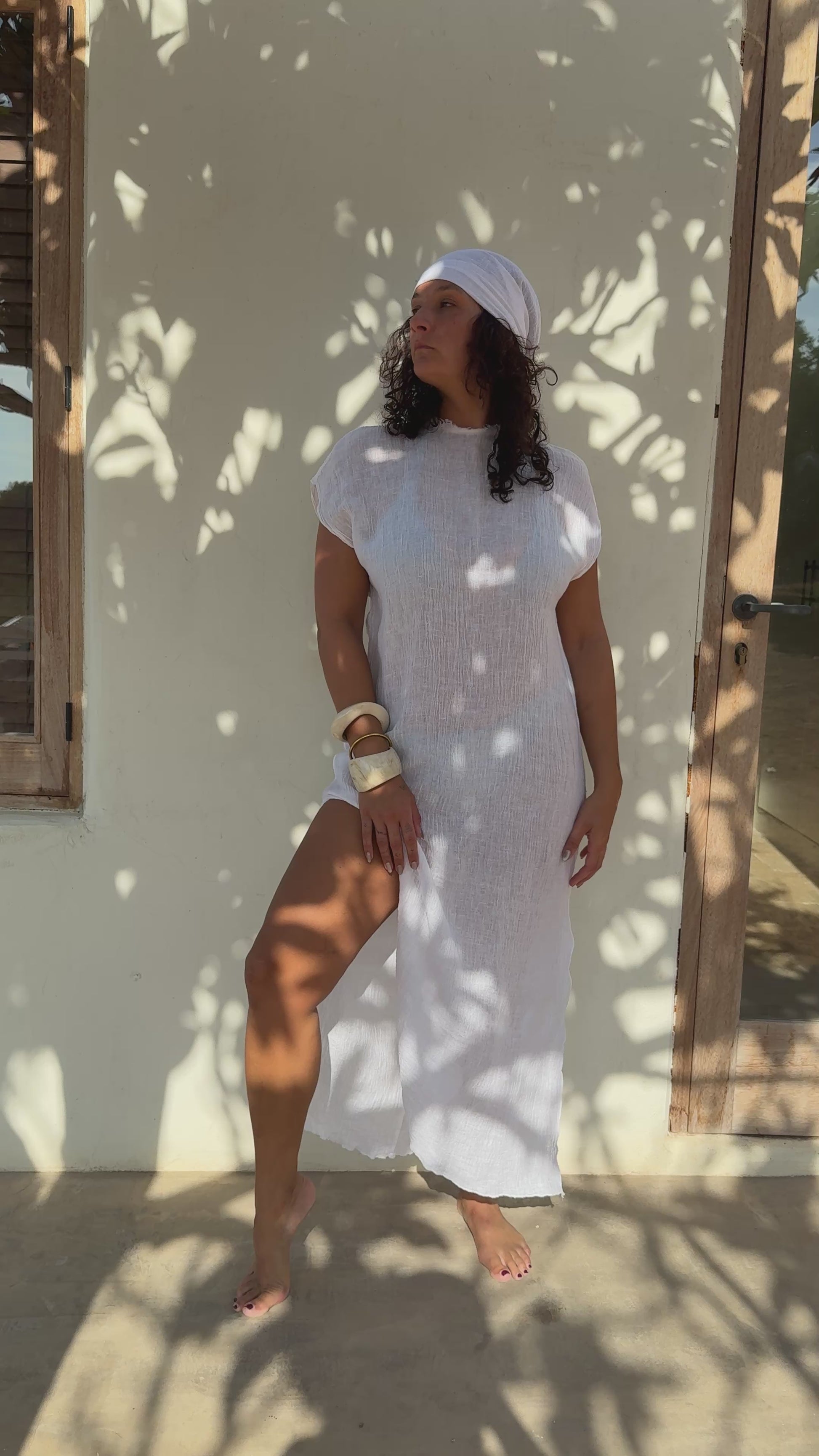 The Pure Linen Kaftan is the essence of effortless elegance. Handcrafted from soft, breathable linen in a clean white tone, it offers an airy, semi-sheer drape that flows gracefully over your swimwear or bare skin. With a flattering high crew neckline, relaxed short sleeves, side slits, and ankle-length silhouette (approx. 140 cm), it’s the kind of piece that feels like sunshine and sea salt.