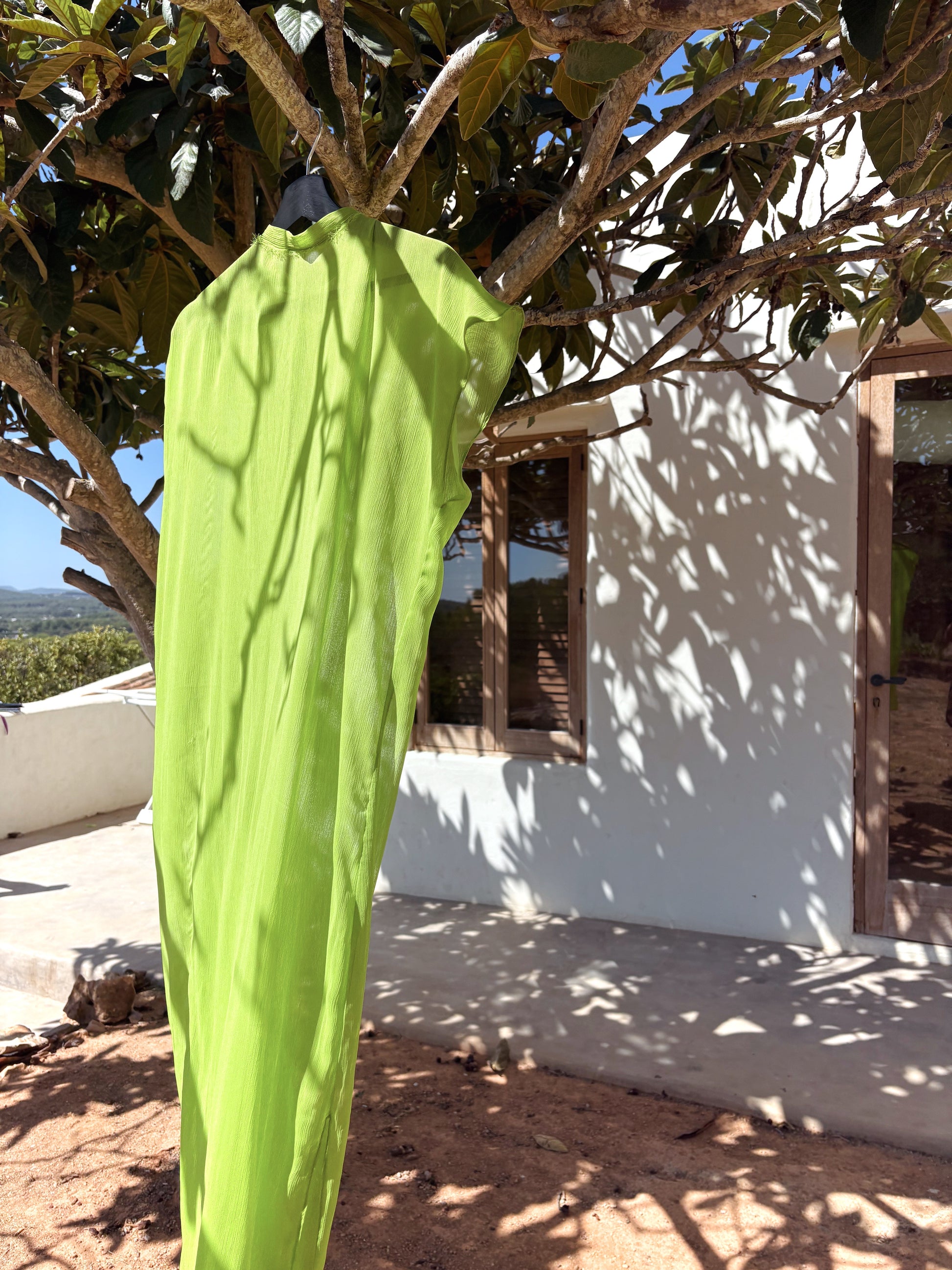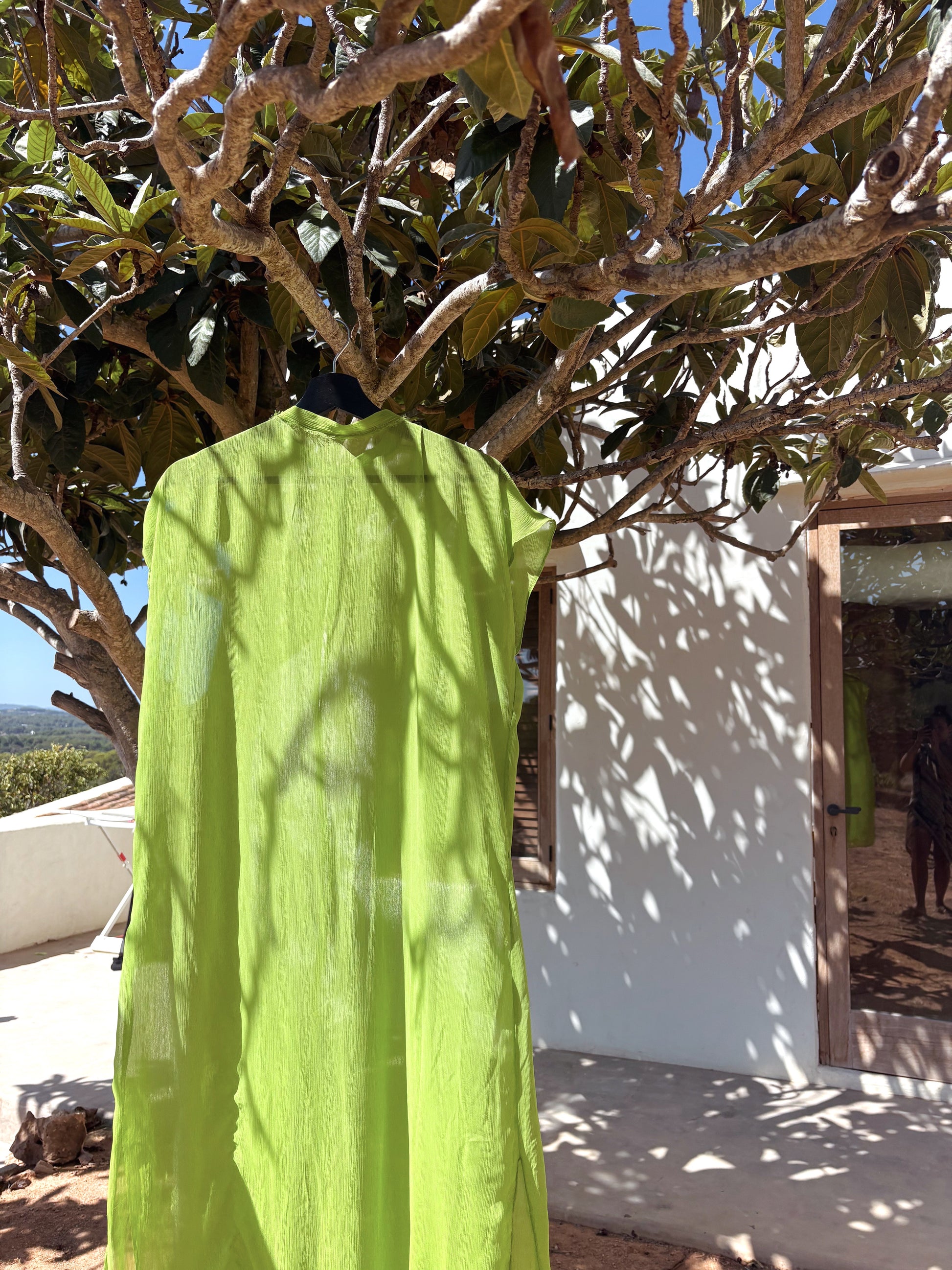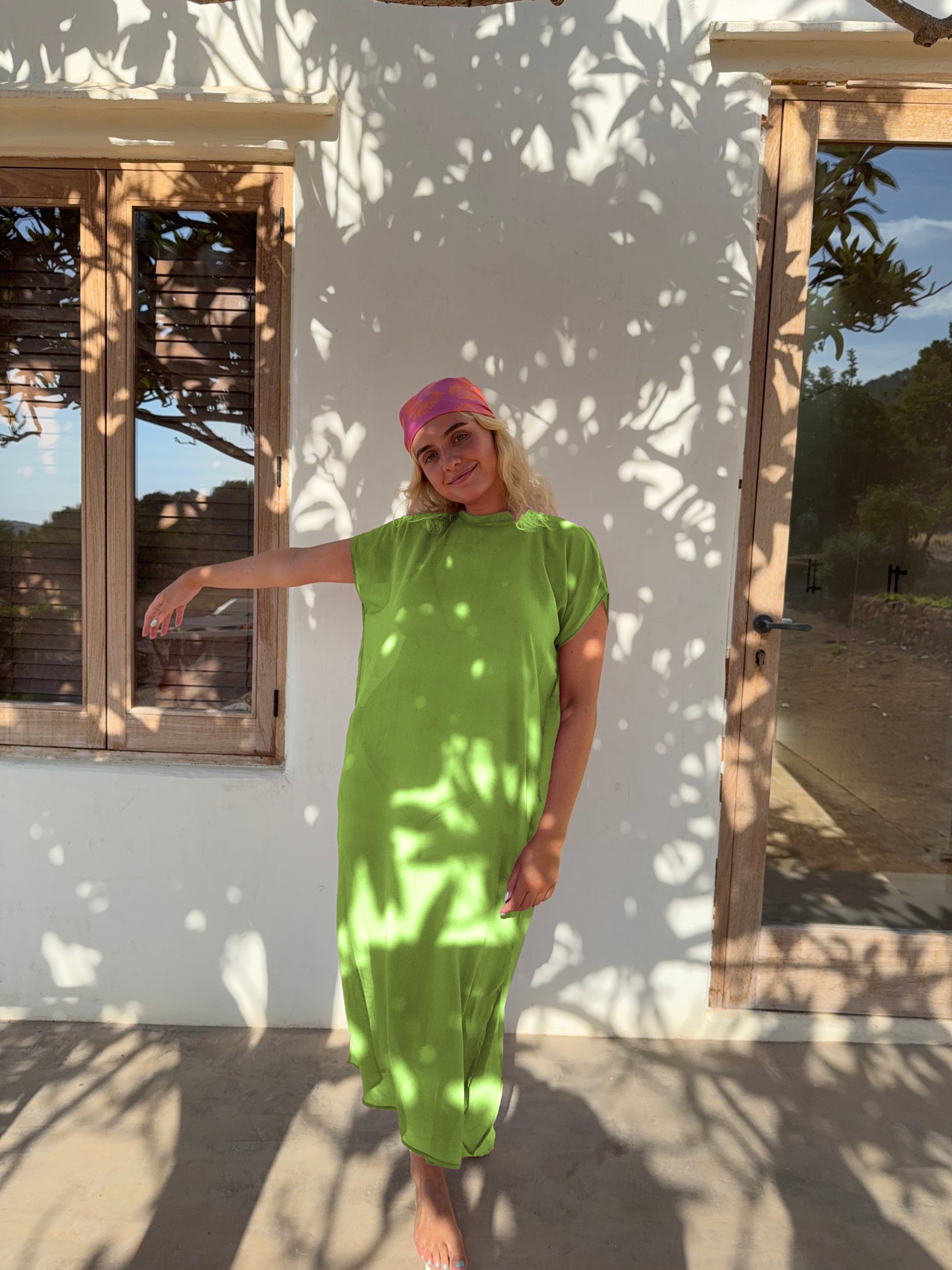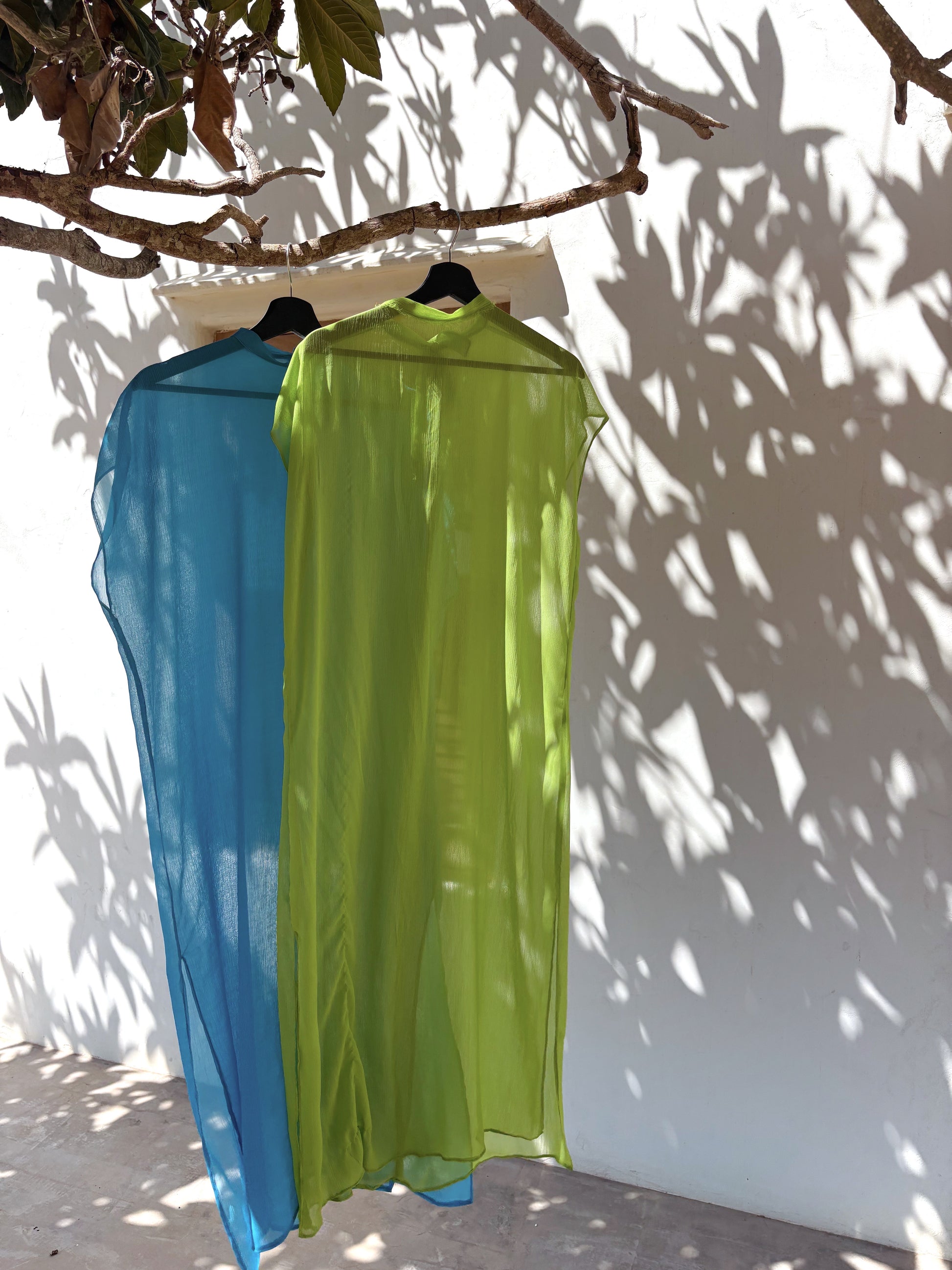 The Olive Veil Kaftan is a semi-sheer, ankle-length piece designed to flow effortlessly over your bikini or lingerie. Crafted in a breathable, lightweight fabric with a subtle crinkled texture, it features a high crew neckline, relaxed short sleeves, and a graceful silhouette with side slits for ease of movement and an elegant drape (approx. 140 cm).